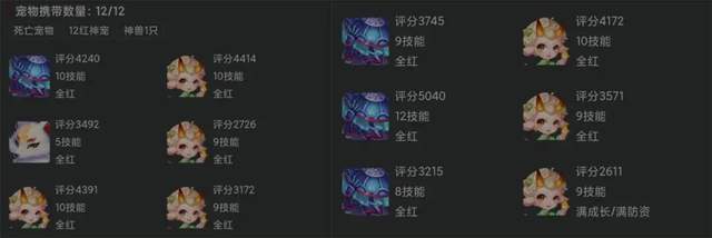 既然装备如此给力,想必宠物配置也不会差到哪去!角色宠物仓库中一共有12只全红宠,并且在资质与技能方面都不容小觑,整体阵容非常强大,接下来我们来瞧几只比较亮眼的。