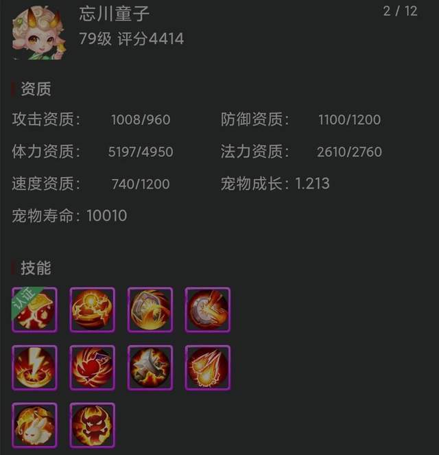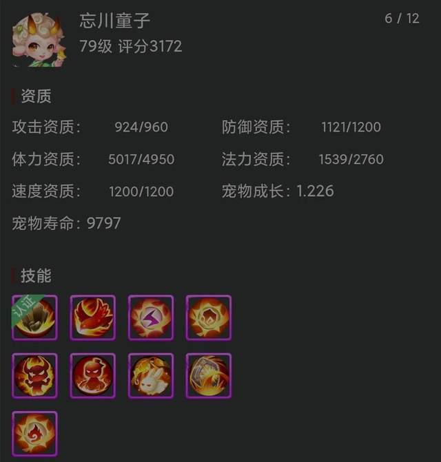 而作为一名方寸山角色,一只优秀的千速宠也是必不可少的。这只认证9技能全红的千速忘川童子就非常不错,速度资质1200已经达到了满值,防御资质1121,体力资质5017也都比较优秀,搭配上1.226的成长值,用来培养成为一只配速宠非常合适。在技能配置中,除了高级敏捷进一步提升速度外,剩下所搭配的都是增强生存能力的技能,在战斗中无论是物理攻击还是法术攻击,对它都造成不了太大影响,实用性非常高。